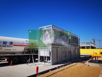 LNG快捷供氣裝置的設(shè)計(jì)遵循燃?xì)庖?guī)范要求,充分考慮到運(yùn)輸方便、安裝簡單、操作方便、安全控制等因素進(jìn)行了模塊化設(shè)計(jì)。裝置由空氣氣化器和調(diào)壓計(jì)量撬兩個集裝箱體組成,其生產(chǎn)全部在工廠完成。運(yùn)到現(xiàn)場后,連接LNG槽車即可通氣。真正做到了現(xiàn)場快速安裝,快捷供氣。